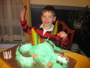 Enjoying his dragon birthday cake